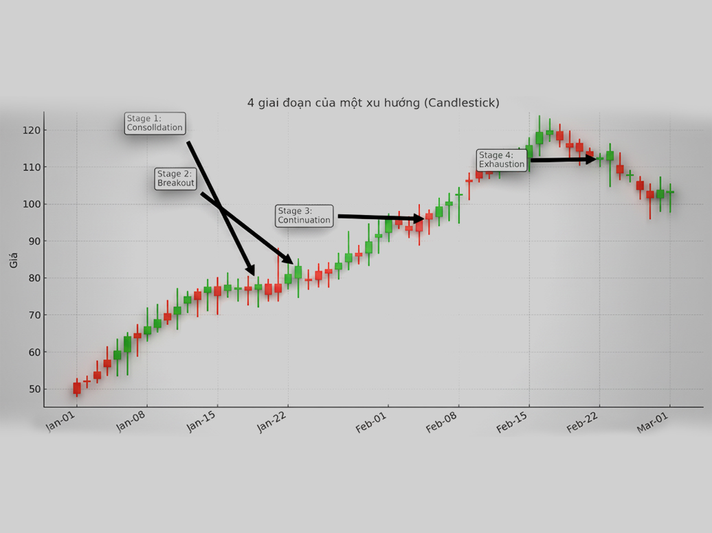 Một xu hướng thường trải qua 4 giai đoạn: Tích lũy – Bứt phá – Duy trì – Kiệt sức. Hiểu rõ các giai đoạn này giúp trader vào lệnh đúng thời điểm, giữ lệnh hiệu quả và quản lý rủi ro tốt hơn. Đây là nền tảng quan trọng để giao dịch thông minh và bền vững.