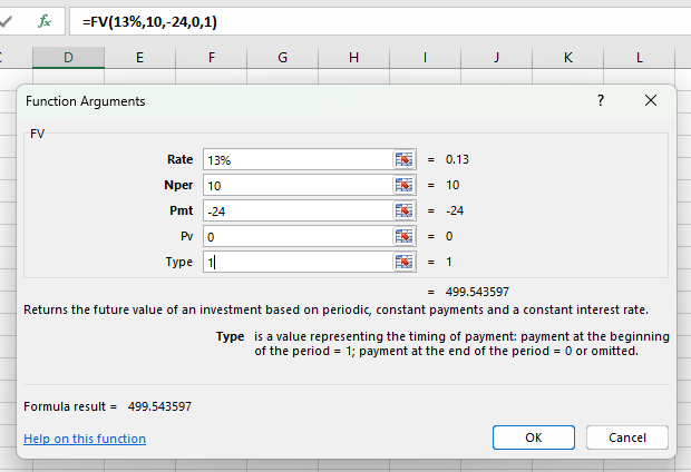 FV = 24 * ((((1 + 13%)^10) - 1) * (1 + 13%)) / 13%