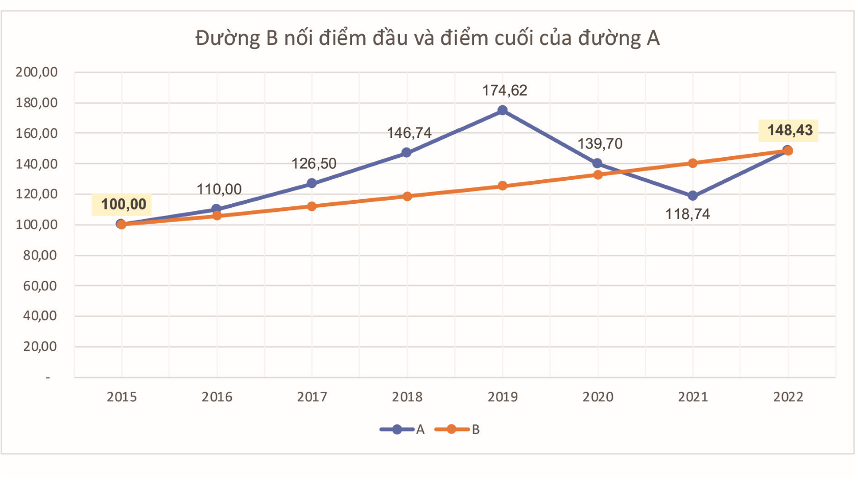 Như vậy khi tính tỷ suất lợi nhuận bình quân tài chính (Geometric Mean), chúng ta xem như tài sản đó có tỷ suất lợi nhuận đều hàng năm. Tức là chúng ta chỉ quan tâm đến điểm bắt đầu (100), điểm kết thúc (148,43) và số kỳ (7).