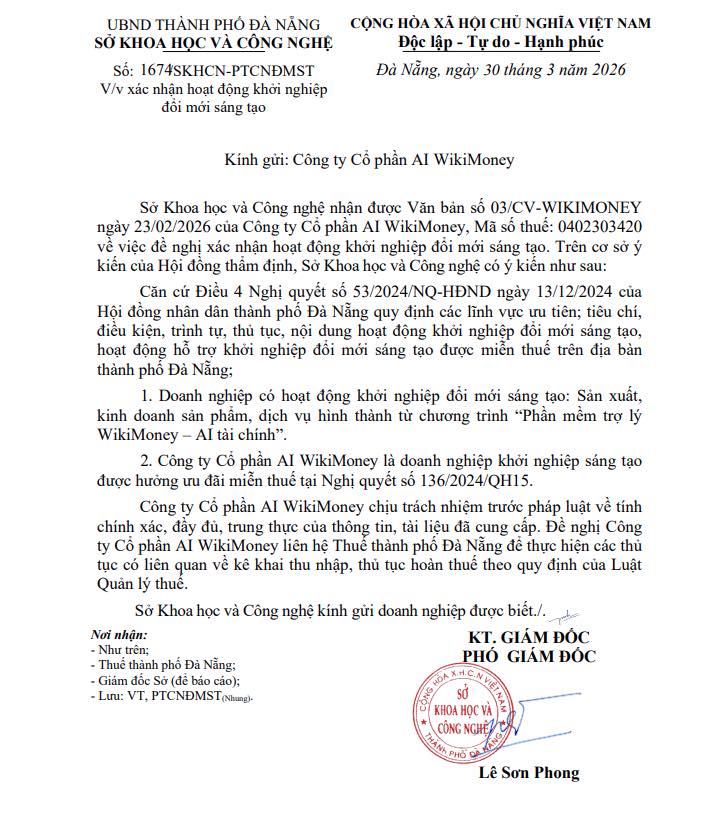 Ngày 30/3/2026, Sở Khoa học và Công nghệ TP. Đà Nẵng đã chính thức công nhận Công ty Cổ phần AI WikiMoney là doanh nghiệp khởi nghiệp sáng tạo. Theo đó, AI WikiMoney được hưởng các ưu đãi đặc thù (bao gồm miễn thuế trong 5 năm) theo Nghị quyết số 136/2024/QH15 của Quốc hội và Nghị quyết số 53/2024/NQ-HĐND của HĐND TP. Đà Nẵng.