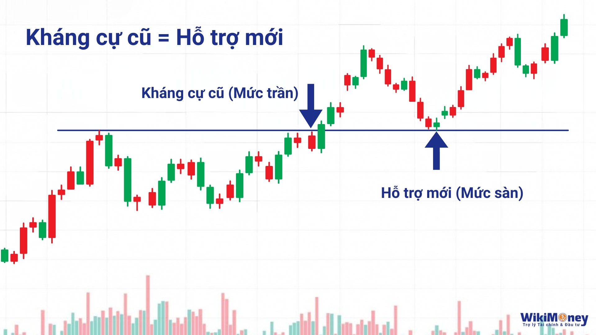 Ví dụ: Giá phá vỡ một vùng kháng cự, đi lên trên nó. Vùng kháng cự cũ lúc này chuyển thành vùng hỗ trợ. Nghĩa là ngưỡng giá mà trước đây từng ngăn cản giá tăng, giờ lại là điểm giữ giá không cho giảm trở lại.