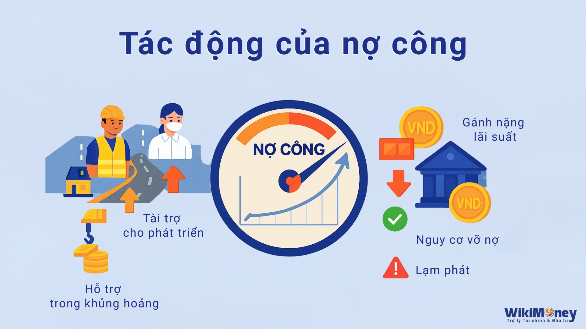 Nợ công có thể có cả tác động tích cực và tiêu cực, giống như việc bạn vay tiền để mở cửa hàng: nếu dùng đúng, có thể kiếm thêm tiền, nhưng nếu không trả được, có thể mất nhà.