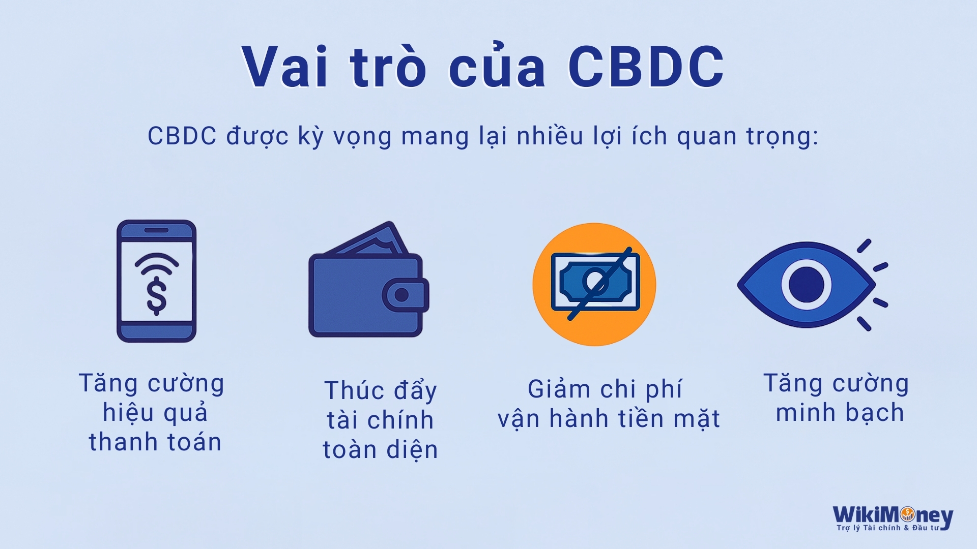 CBDC giúp giảm chi phí in ấn, vận chuyển tiền mặt. Công nghệ blockchain hỗ trợ truy vết giao dịch, chống rửa tiền và gian lận tài chính, phù hợp với nỗ lực minh bạch hóa kinh tế.