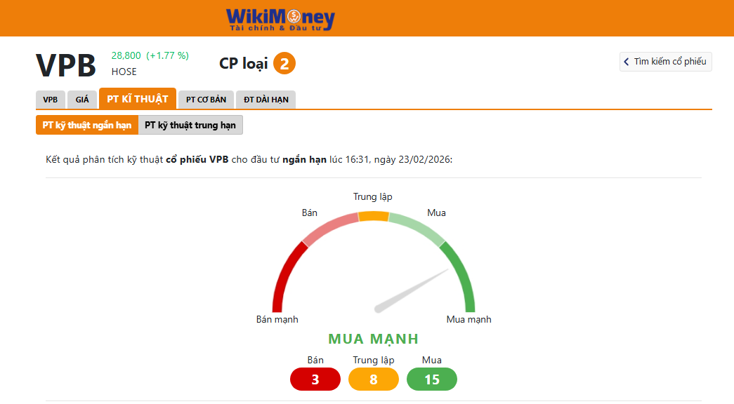 Dưới đây là hình chụp phân tích kỹ thuật ngắn hạn của VPB chiều ngày 23/2/2026.