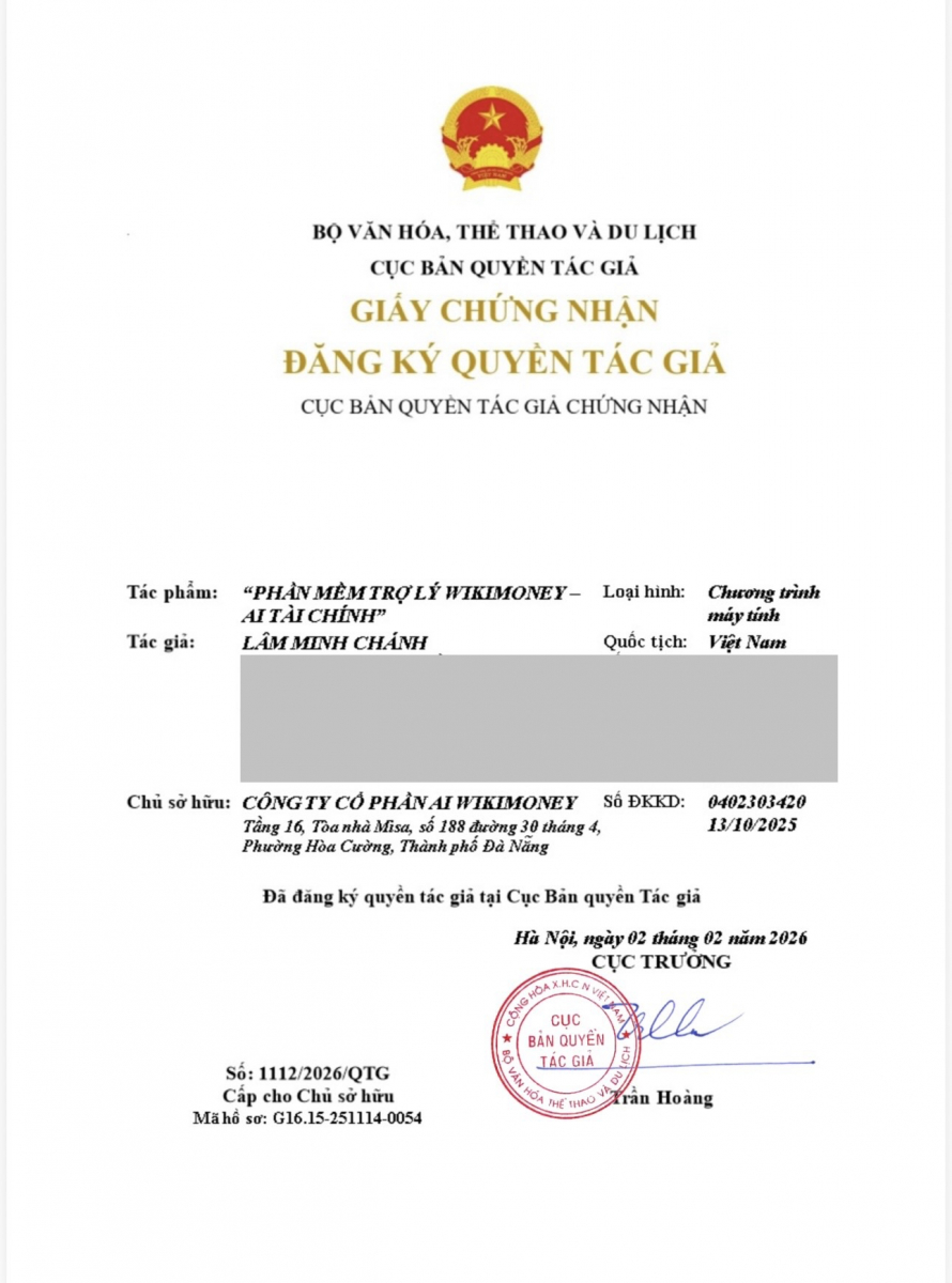 Vào ngày 02/02/2026, AI Tài chính WikiMoney đã chính thức được Cục Bản quyền Tác giả cấp Giấy chứng nhận đăng ký quyền tác giả.